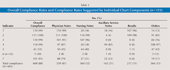 Overall, compliance was 88% for the 7 performance measures. Physician notes were the most accurate chart component but, if examined alone, would have only resulted in a reported rate of 81% adherence to indicators. Review of the nursing notes, ancillary service notes, results, and orders was required to fully document quality of care. Ceiling effects were noted for 4 of the 7 quality indicators as noncompliance was rare for these measures.