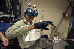 Astronaut Robert L. Satcher Jr., MD, PhD, an STS-129 mission specialist, uses virtual reality hardware in the Space Vehicle Mock-up Facility at NASA’s Johnson Space Center to practice some of the duties he will be performing during his mission to the International Space Station.