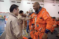 United Space Alliance suit technician Raymond Cuevas (left) assists Satcher with a training version of his shuttle launch and entry suit in preparation for a water survival training session in the Neutral Buoyancy Laboratory.