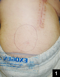 Patients were reassessed postoperatively at 6 weeks, 3 months, 6 months, 1 year, and 2 years. Conventional radiography and physical examination were part of every postoperative visit. At each follow-up visit, each patient was questioned regarding the presence of numbness or paresthesias in the distribution of the lateral femoral cutaneous nerve. If numbness or paresthesia was present, the patient was asked to outline the area with a marking pen. This area was digitally photographed with a ruler in place (Figure 1). Image J software6 (National Institutes of Health, Bethesda, Maryland) was used to measure the affected area. This protocol was repeated at all subsequent postoperative visits. All data regarding lateral femoral cutaneous nerve paresthesia were collected prospectively. Patients with permanent injury were questioned regarding impairment. They were asked to describe the impairment (numbness, partial numbness, burning, pain) and level of concern (constant, often, occasional, never).