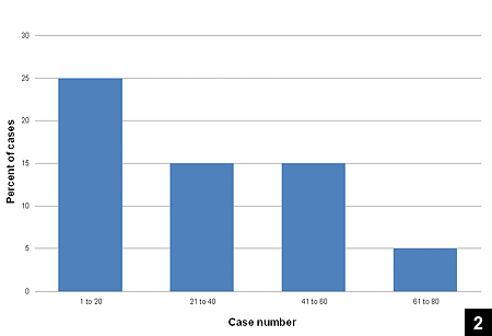 The surgeon’s (M.W.H.) learning curve correlated positively with impairment (paresthesia) of the lateral femoral cutaneous nerve: the incidence was 25% for the first 20 cases and only 5% for the final 20 cases (Figure 2). Of the 12 cases of lateral femoral cutaneous paresthesia, 11 (92%) occurred in the first 47 cases (23% incidence) and only 1 occurred in the last 34 cases (3% incidence).