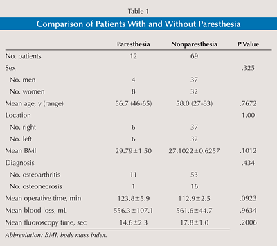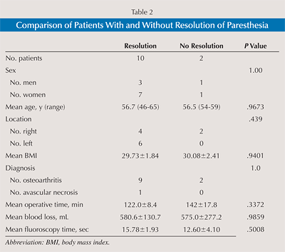 We found no statistically significant difference in demographics, laterality, BMI, diagnosis, or operative parameters between patients with and without paresthesias (Table 1) or between patients with resolved or unresolved paresthesias (Table 2).