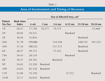 The average size of the affected area was 93.21 cm2 (range, 28-398 cm2) at initial follow-up. Of the 2 patients with permanent paresthesia, 1 showed a sizable decrease (initial follow-up, 77.70 cm2; final follow-up, 25.66 cm2), and the other showed no substantial change (initial follow-up, 109.89 cm2; final follow-up, 108.54 cm2). The size of the initial area affected did not correlate with time to resolution. The 2 patients with permanent injury were questioned regarding impairment. Both described the impairment as partial numbness without symptoms of meralgia, such as burning or pain. Both patients reported the paresthesia was of no concern and only noticeable during clinical examination.